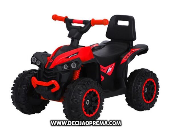 Dečiji Quad na akumulator je moderno vozilo koje će biti omiljeno svakom mališanu. Izuzetno je stabilan,namenjen je za jedno dete, uzrasta od 1-4 godina, maximalne težine 25kg. Poseduje muzičke i svetlosne efekte. Akumulator 6v. Punjač 6V. Dimenzije: 67x43x50cm. Težina proizvoda: 5.5 kg.